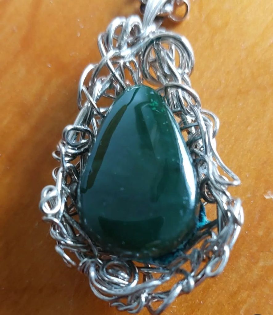 The semi-precious jeweley involves a unique style of wire wrapping for a variety of local and international stones. Sometimes, the stones are added to costume jewelry in the reinventing of an old piece or removed from an old piece to use in a new design!